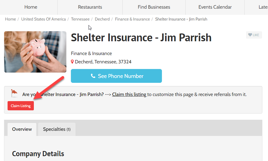 - CLICK <View Listing> on the correct business you want to claim. In this case I will click on Shelter Insurance - Jim Parrish